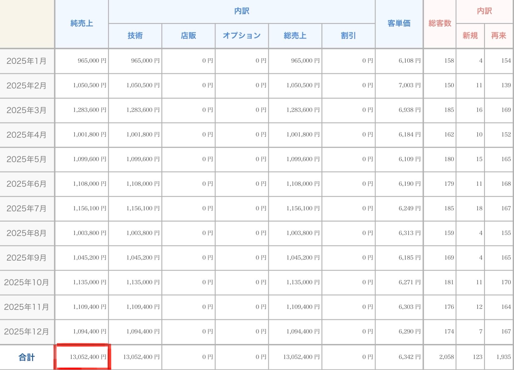 サロンボード(ホットペッパービューティー)の集計・分析の月間売上100万円/年間売上1300万円(2025年)を達成した証拠画像です。
